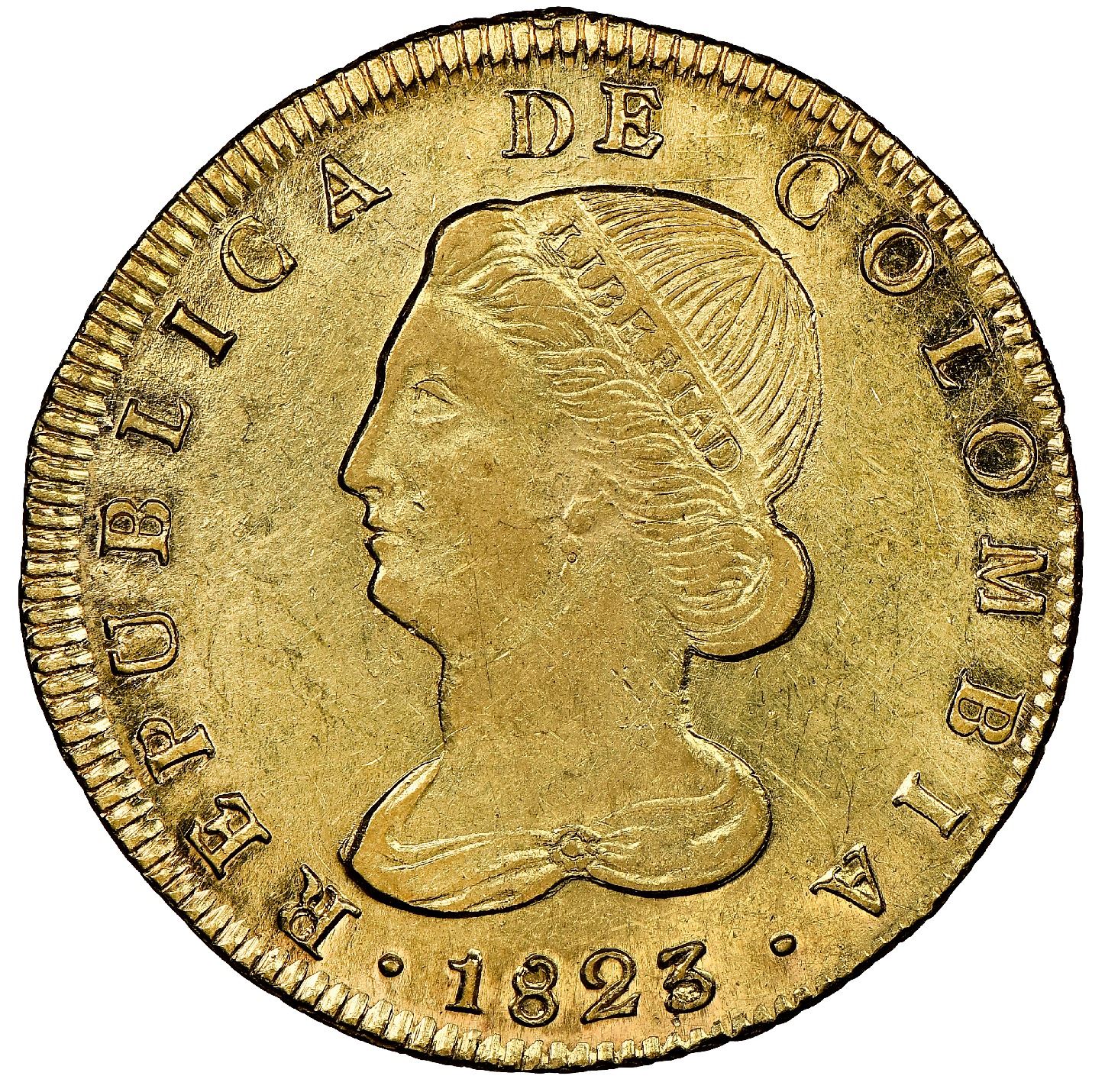 Popayan, Colombia, gold 8 escudos, 1823FM, NGC AU 58 ("top pop"), ex-Millennia (stated on label). Sed-7; Restrepo-166.3; KM-82.2. Nice luster and well-detailed strike, minimal marks and high-point wear, tied with two others for finest known in NGC census, rated as R in Sedwick. NGC #1950242-023. Pedigreed to the Esmeralda Collection (stated on special label) and to the Millennia Collection (Goldberg auction of May 2008, lot 1027).