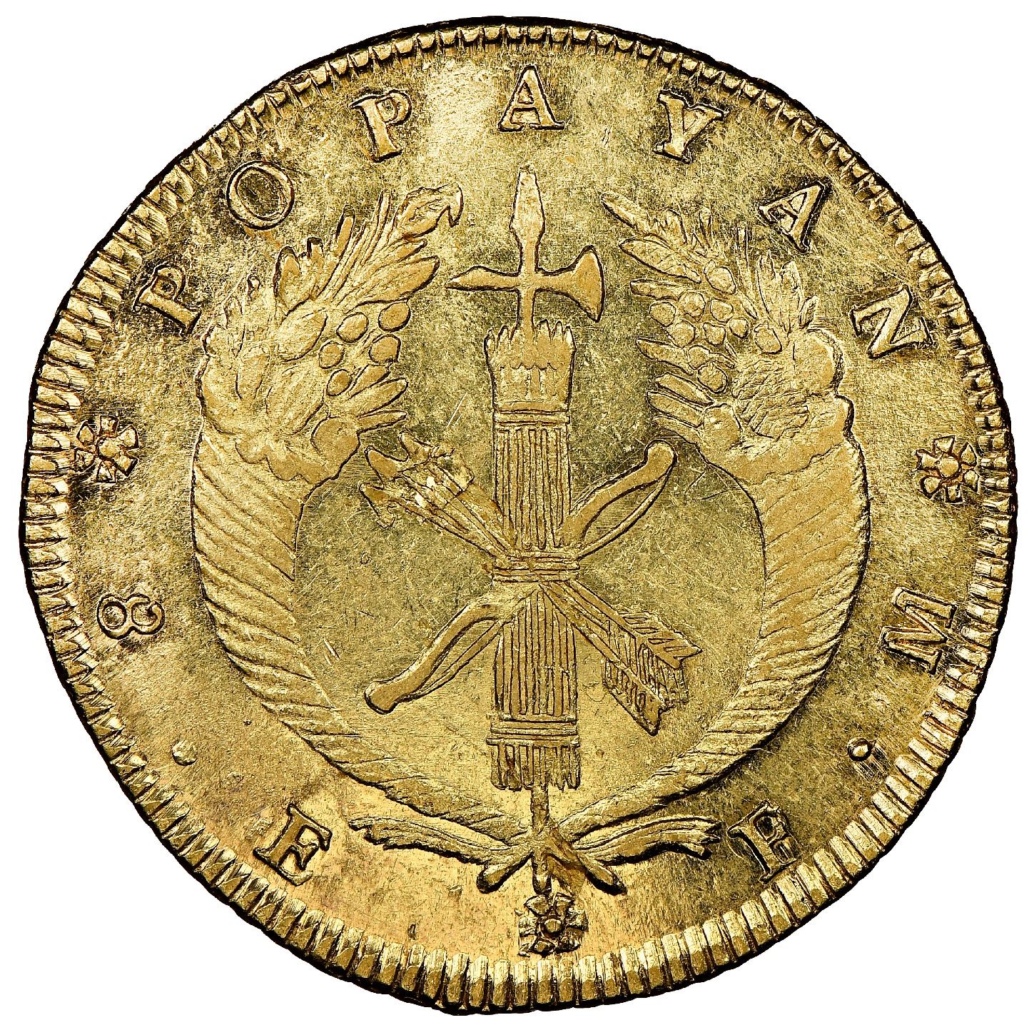 Popayan, Colombia, gold 8 escudos, 1823FM, NGC AU 58 ( top pop ), ex-Millennia (stated on label).
