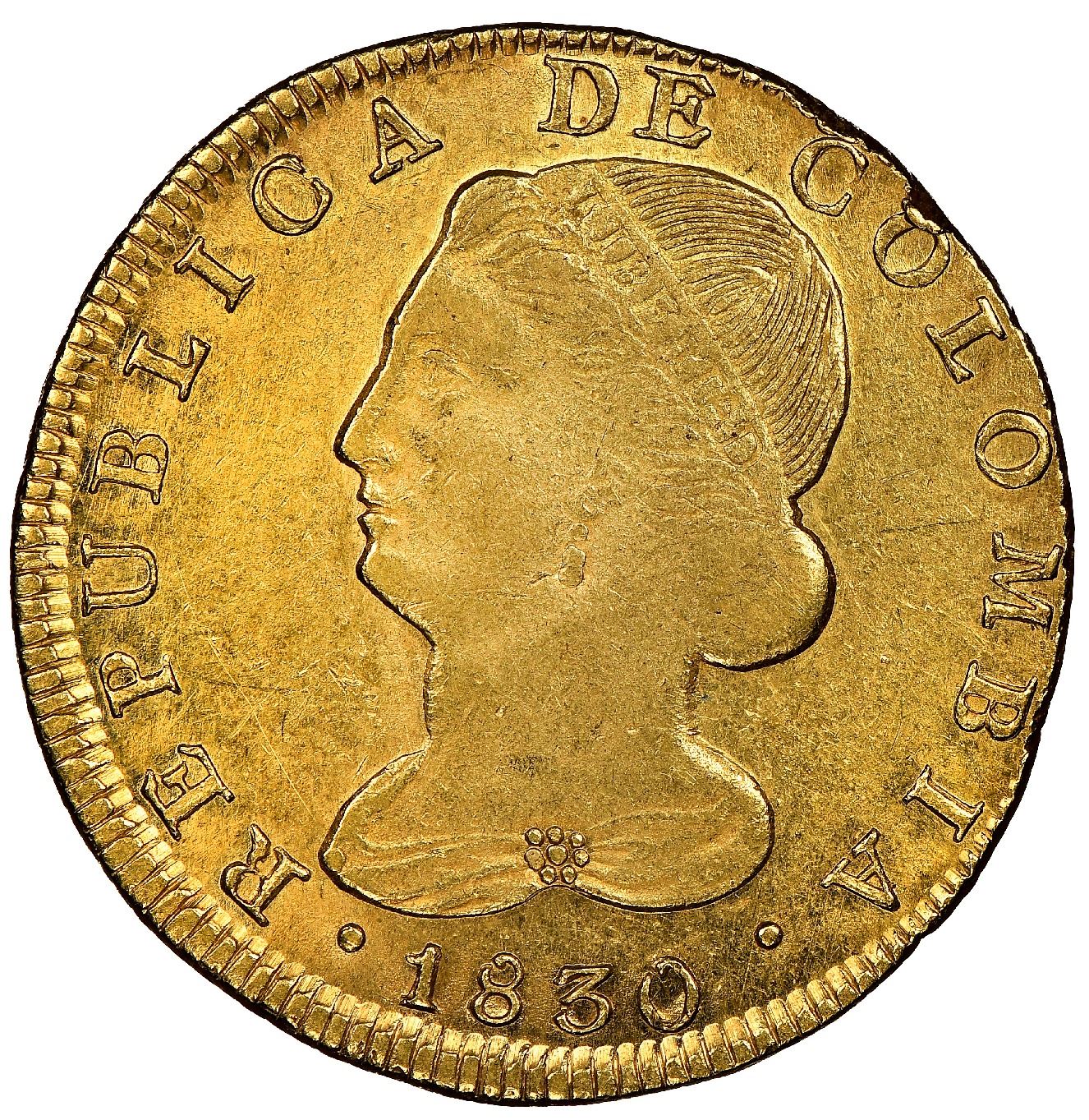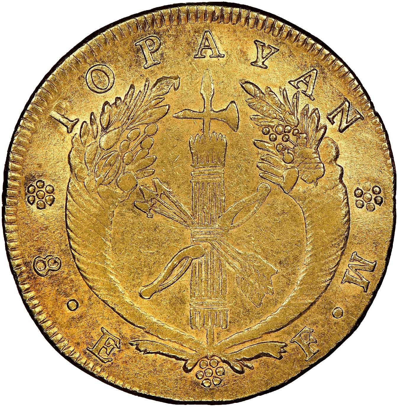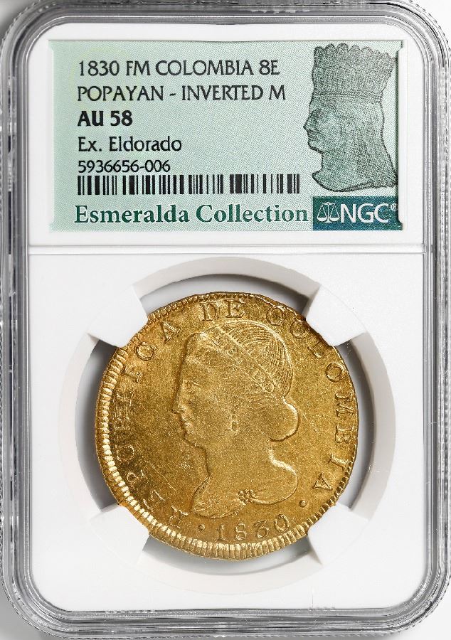 Popayan, Colombia, gold 8 escudos, 1830FW (inverted M), rare, NGC AU 58, finest known, ex-Eldorado (stated on label). Sed-7; Restrepo-166.26; KM-82.2. Good but off-center strike, nice luster and color, some high-point wear but nevertheless the finest and only example at NGC and finer than three in PCGS census (one of which is this coin crossed over), rated as RRR in Sedwick ("scarce" in Restrepo). NGC #5936656-006. Pedigreed to the Esmeralda Collection (stated on special label) and to the Eldorado Collection (Stack's Bowers auction of January 2018, lot 12127).
