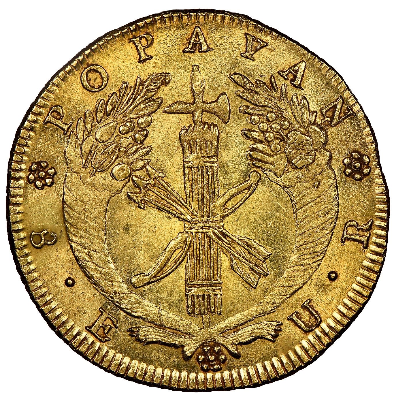 Popayan, Colombia, gold 8 escudos, 1830UR, NGC MS 64, finest known, ex-Eliasberg (stated on label).