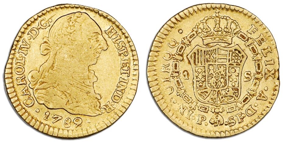 Popayan, Colombia, gold bust 1 escudo, Charles IV transitional (bust of Charles III, ordinal IV/III), 1789/8SF. Restrepo-83.1; KM-54.2; Cal-1144. 3.34 grams. Lustrous XF with part of rim crude (as made), no problems.
