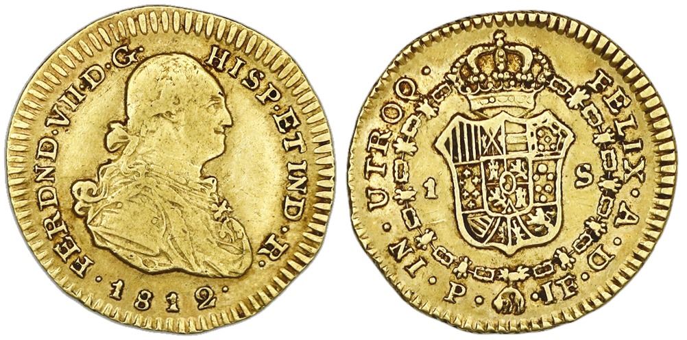 Popayan, Colombia, gold bust 1 escudo, Ferdinand VII (bust of Charles IV), 1812JF.