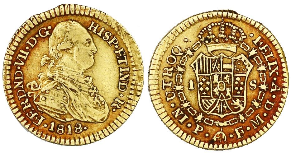 Popayan, Colombia, gold bust 1 escudo, Ferdinand VII (bust of Charles IV), 1818FM.