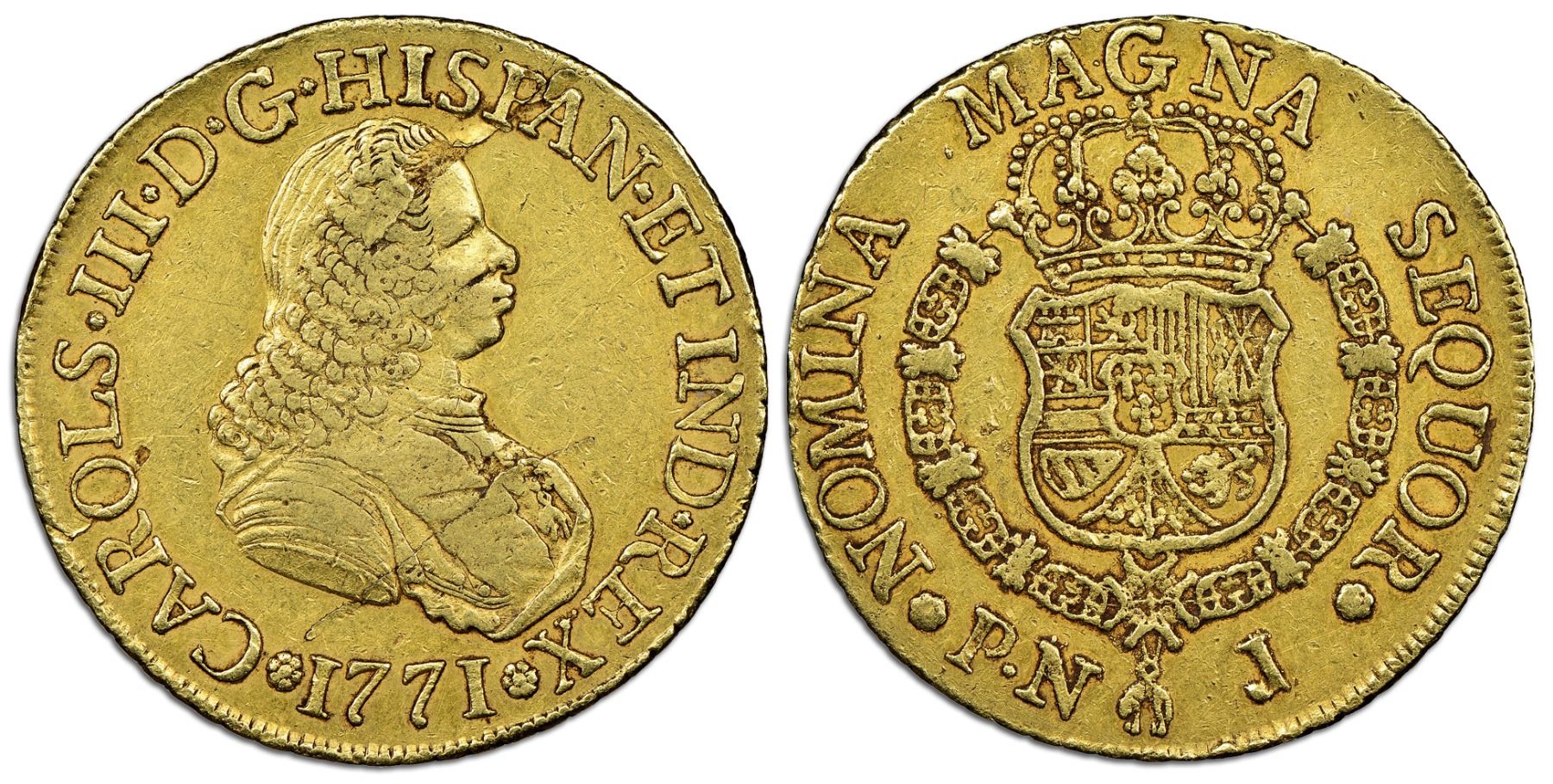 Popayan, Colombia, gold bust 8 escudos, Charles III (bust of Ferdinand VI), 1771J, NGC VF 30. Restrepo-70.22; KM-38.2; Cal-2036. Bold details with toning in crevices, minor laminations but no big problems. NGC #5850275-005.