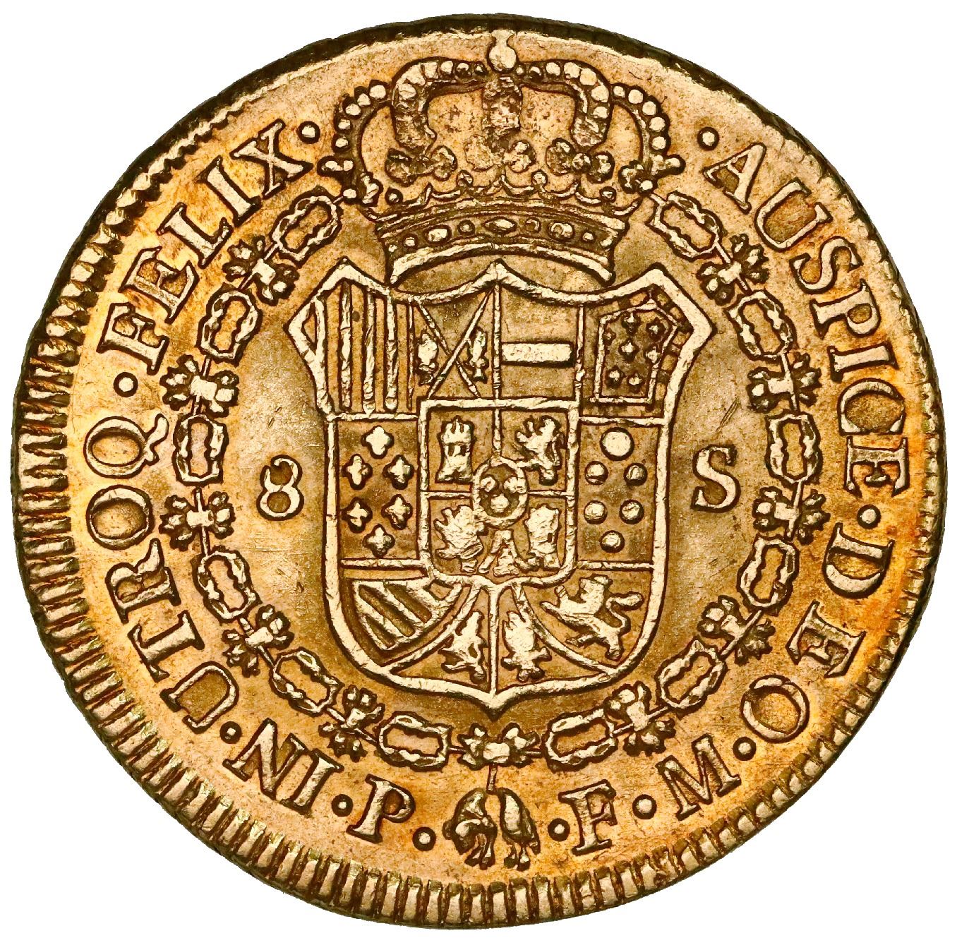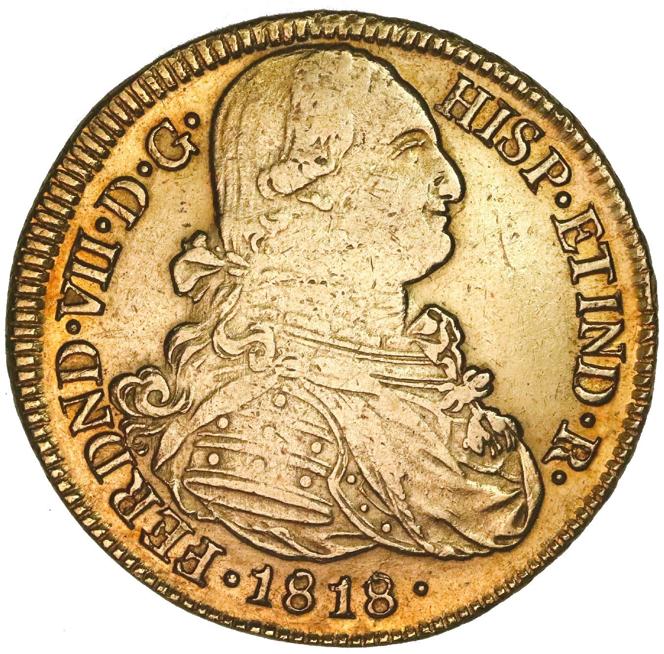 Popayan, Colombia, gold bust 8 escudos, Ferdinand VII (bust of Charles IV), 1818FM. Restrepo-128.31; KM-66.2; Cal-1823. 26.87 grams. Lightly polished XF/AU with full rims despite slightly off-center reverse. Pedigreed to the Ponterio auction of April-May, 2004, with original lot-tag 432.