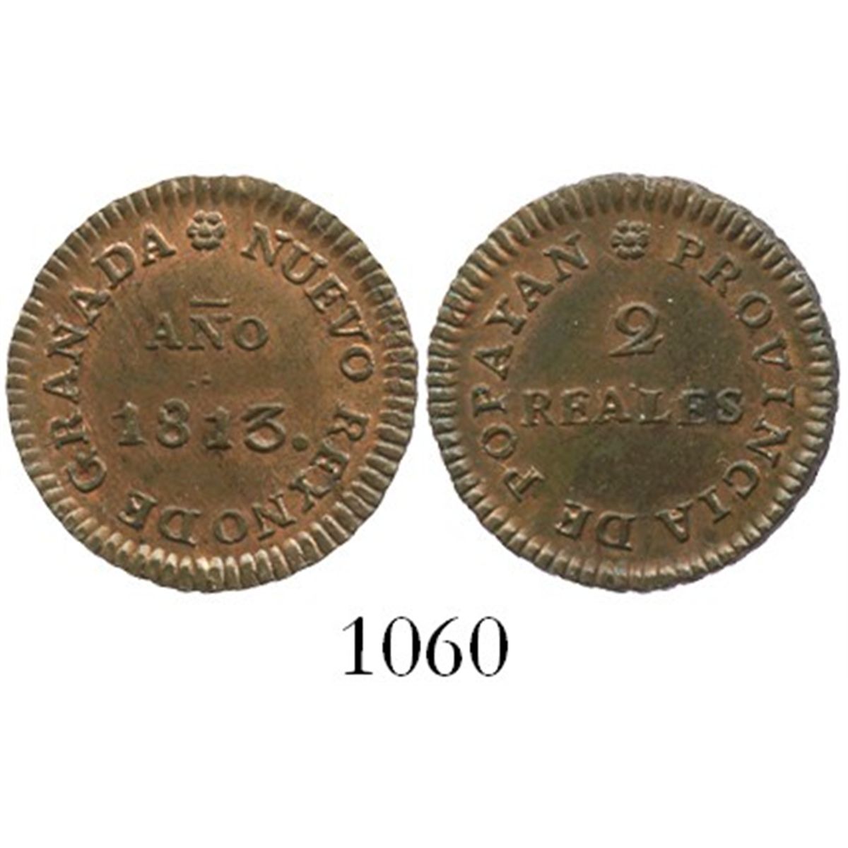 Popayan (Royalist), Colombia, copper 2 reales, 1813. R-116.1; KM-B2. 1.7 grams. Lovely UNC with original luster and color in legends.