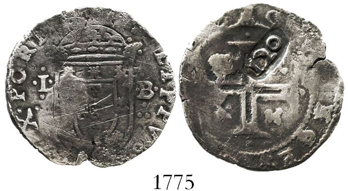 Portugal, 120 reis, "120" countermark (1642), Joao IV, on a Philip II or III tostao (100 reis) of the late 1500s to early 1600s, with L to left and B to right. 6.9 grams. Host Fine, countermark VF, all nicely toned, with minor edge-split.