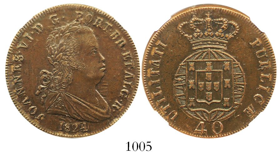 Portugal, bronze 40 reis, Joao VI, 1824, encapsulated NGC AU 55 BN, finest known in NGC census.