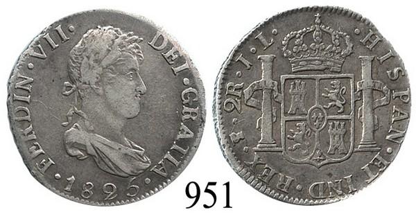 Potosí, Bolivia, bust 2 reales, Ferdinand VII, 1825JL. KM-83. 6.7 grams. Nice AXF, typically crude around edge but attractively toned, desirable final year of colonial issues.