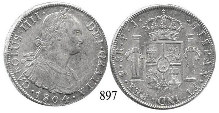 Potosí, Bolivia, bust 8 reales, Charles IV, 1804PJ. KM-73. 27.0 grams. From the ca.-1808 "Cuzco hoard" in Peru. Very lustrous UNC (conserved), nice strike.