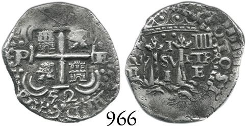 Potosí, Bolivia, cob 1 real, 1652E transitional, McLean Type VI, variety with two dots below crown. S-P37, KM-B13.2. 2.9 grams. Very choice specimen with full pillars-side data and crown and Potosí in legend, unbelievably well-detailed full cross, XF+ with beautifully contrasting toning. Pedigreed to the Mark Bir collection.