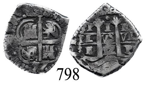 Potosí, Bolivia, cob 1 real, 1657E. S-P37a. 3.4 grams. Good full pillars-and-waves, full cross, 3 dates, 2 mintmarks and assayers, richly toned Fine.