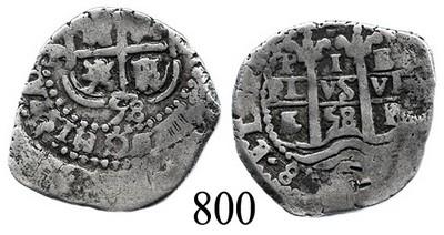 Potosí, Bolivia, cob 1 real, 1658E. S-P37a. 3.8 grams. Choice pillars side with full inner details and also bold 8 of date in legend, good but very off-center cross with full third date, much legend, nicely toned AVF.