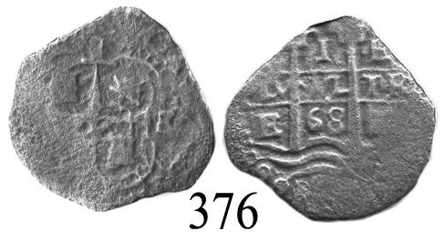 Potosí, Bolivia, cob 1 real, 1668E. S-P37b. 1.8 grams. Full pillars-and-waves with two dates on that side, cross corroded, thin. Recovered from: Consolación, sunk in 1681 off Santa Clara Island, Ecuador. With baseball card-type ROBCAR certificate.