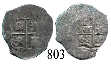 Potosí, Bolivia, cob 1 real, 1668E. S-P37b. 2.8 grams. Good full cross, one full pillar, bold date, toned AVF.
