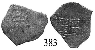 Potosí, Bolivia, cob 1 real, 1670E. S-P37b. 2.1 grams. Bold 70 between good pillars, cross very weak, broad flan but thin from corrosion. Recovered from: Consolación, sunk in 1681 off Santa Clara Island, Ecuador. With photo-certificate.
