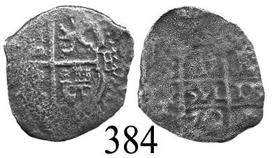 Potosí, Bolivia, cob 1 real, 1670E. S-P37b. 1.2 grams. Full pillars, good but incomplete cross, very thin from corrosion. Recovered from: Consolación, sunk in 1681 off Santa Clara Island, Ecuador. With ROBCAR photo-certificate.