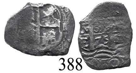 Potosí, Bolivia, cob 1 real, 1675E. S-P37b. 2.2 grams. Bold date, full waves, most of cross, crude from corrosion. Recovered from: Consolación, sunk in 1681 off Santa Clara Island, Ecuador. With photo-certificate.