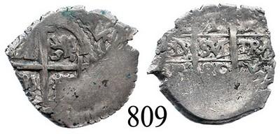 Potosí, Bolivia, cob 1 real, 1680V, mintmark and assayer transposed on pillars side, rare.