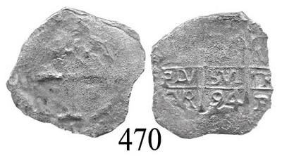 Potosí, Bolivia, cob 1 real, 1694VR. S-P40. 2.1 grams. One full pillar, clear date and assayer, full cross, very thin from corrosion. Recovered from: Spanish 1715 Fleet, east coast of Florida.