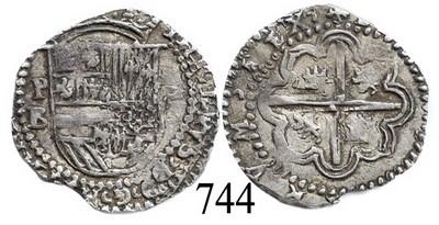 Potosí, Bolivia, cob 1 real, Philip II, P-B (2nd period). S-P6. 3.3 grams. Very sharply detailed XF with full shield and cross (the latter slightly doubled), much legend, nice toning.
