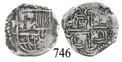 Potosí, Bolivia, cob 1 real, Philip III, P-C, rare. S-P16. 3.0 grams. Very clear P-C (rare assayer) to left of very well-detailed full shield, good but slightly doubled full cross, attractively toned AVF.