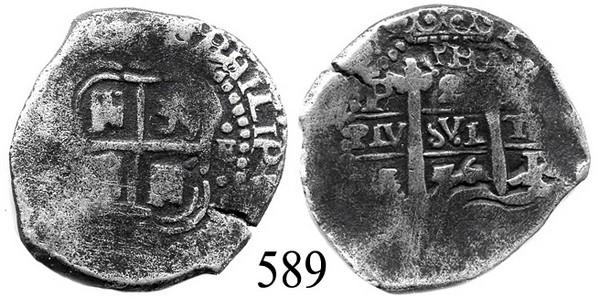 Potosí, Bolivia, cob 2 reales, 1656E. S-P37a. 6.8 grams. Broad flan with full cross and pillars, well-detailed full crown above PH, full PHILIP in legend, 2 assayers and mintmarks, no corrosion but some flatness, nicely toned. Recovered from: Piedmont, sunk in 1795 off the south of England. With photo-certificate #6536.