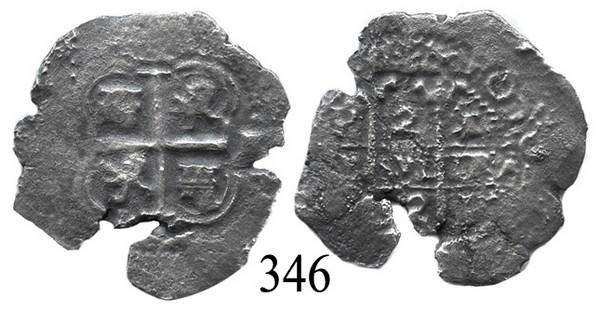 Potosí, Bolivia, cob 2 reales, 1662E. S-P37a. 3.7 grams. Very crude planchet yet with nice full cross, full pillars and crown, some corrosion. Recovered from: Consolación, sunk in 1681 off Santa Clara Island, Ecuador. With photo-certificate.