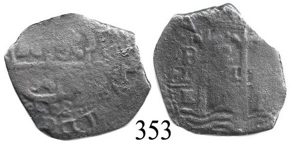 Potosí, Bolivia, cob 2 reales, 1668E. S-P37b. 4.5 grams. Full but weak pillars-and-waves, off-center cross with part of king's name and ordinal in legend, worn from corrosion. Recovered from: Consolación, sunk in 1681 off Santa Clara Island, Ecuador. With photo-certificate.
