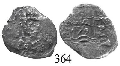 Potosí, Bolivia, cob 2 reales, 1679C. S-P38. 3.3 grams. Nice full date and mintmark above full but off-center waves, cross side messy from corrosion. Recovered from: Consolación, sunk in 1681 off Santa Clara Island, Ecuador. With photo-certificate.