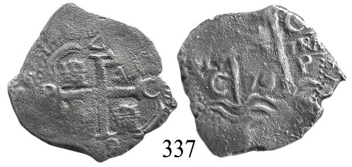 Potosí, Bolivia, cob 4 reales, 1679C. S-P38. 9.6 grams. Full cross, 2 dates and mintmarks, 3 assayers on an odd-shaped planchet, thin from corrosion. Recovered from: Consolación, sunk in 1681 off Santa Clara Island, Ecuador. With ROBCAR photo-certificate.