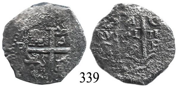 Potosí, Bolivia, cob 4 reales, 1679C. S-P38. 10.2 grams. Good cross, 2 mintmarks, solid but corroded all over. Recovered from: Consolación, sunk in 1681 off Santa Clara Island, Ecuador. With ROBCAR photo-certificate #7072.