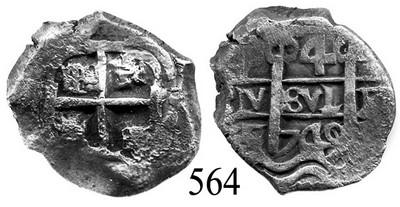 Potosí, Bolivia, cob 4 reales, 1749q. S-P50a. 11.6 grams. Good full cross, nice full pillars and waves, typically thick and chunky, no corrosion except on piece of edge, attractively toned, the 9 of the date clearly re-punched over another 9. Recovered from: Unidentified wreck sunk ca. 1755 off Spain.