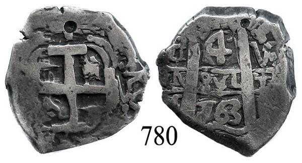 Potosí, Bolivia, cob 4 reales, 1763V-(Y). S-P57. 13.5 grams. Nice full cross and full pillars, bold date and 2 assayers, attractively toned Fine with old partial hole (not all the way through) at top of cross.