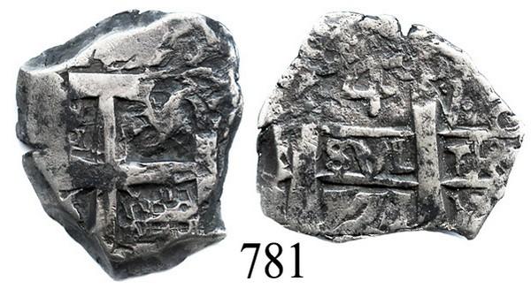 Potosí, Bolivia, cob 4 reales, 1771V-(Y). S-P59. 13.3 grams. Very chunky and crude in shape and thickness but with clear date and assayer and denomination and decent (oversized) cross, toned VF for period.