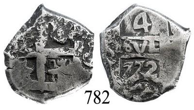 Potosí, Bolivia, cob 4 reales, 1772V-(Y). S-P59. 13.3 grams. Bold 4-SVL-772 over waves, most of (oversized) cross, typically very chunky but with nice contrast and sharp edges, AVF for era.