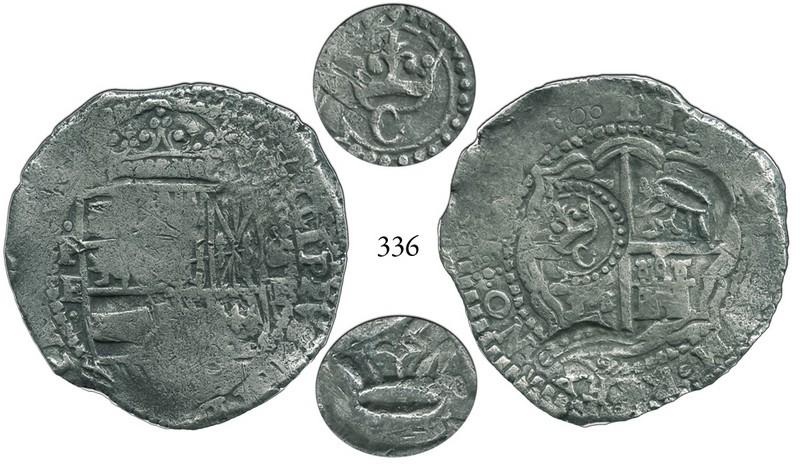 Potosí, Bolivia, cob 8 reales, 1(65)1E, with 3 countermarks on cross side (very rare): crowned C (rare), crown alone (very rare) and arms. S-P36, KM-19b, CT-511. 26.6 grams. Broad and very solid planchet (no corrosion) with 2 full and rare countermarks in the center of the full cross and a slightly more common arms countermark in the periphery (very rare combination), the shield full but weak but surrounded by a clear P-E and 8-E and crown. Pedigreed to the Louis Hudson collection. Recovered from: Capitana (Jesús María de la Limpia Concepción), sunk in 1654 off Chanduy, Ecuador