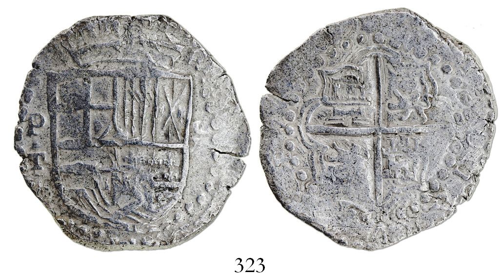 Potosí, Bolivia, cob 8 reales, (161)9T, unique error lacking lions and castles in shield, Grade 1, original tag and certificate missing. S-P21; KM-10; CT-133. 26.63 grams. Very broad flan with good full shield and cross, the former lacking anything but shadows of the lions and castles in the upper-left quadrant (decidedly not simply worn away), practically no surface corrosion. With Sedwick certificate from 2009. Recovered from: Atocha, sunk in 1622 west of Key West, Florida
