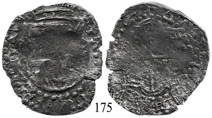 Potosí, Bolivia, cob 8 reales, 1619(T), Grade 3. S-P21. 23.5 grams. Full and clear 1619 date, the cross and shield also full but almost completely flat, some corrosion, uneven flan. Recovered from: Atocha, sunk in 1622 west of Key West, Florida. With Fisher certificate #157866.