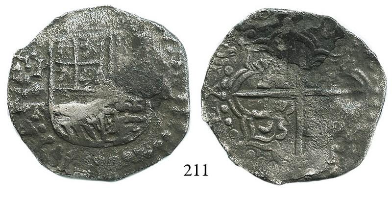Potosí, Bolivia, cob 8 reales, 1620T, Grade 1. S-P21, KM-10, CT-137. 22.8 grams. Full cross and shield, clear bottom half of all 4 digits of date, full P+T, but somewhat crudely corroded and with patches of dark encrustation. With original Fisher certificate #260539. Recovered from: Atocha, sunk in 1622 west of Key West, Florida
