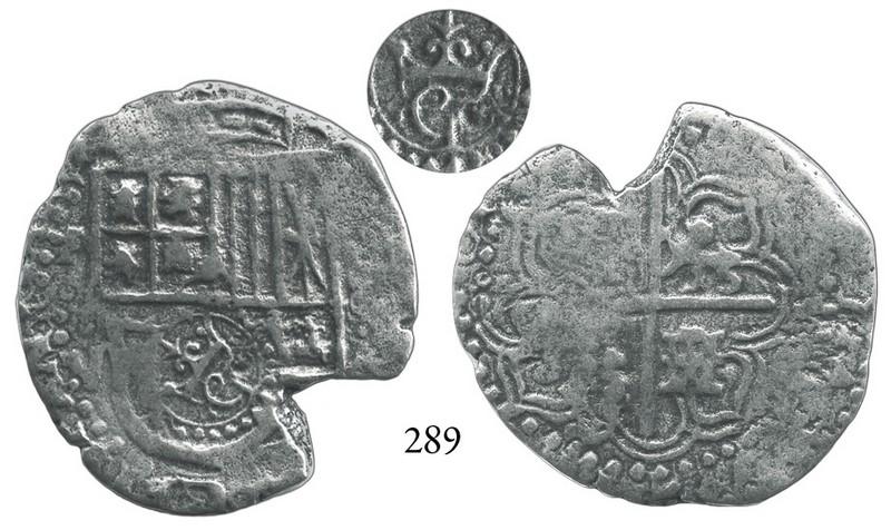 Potosí, Bolivia, cob 8 reales, (1646)V (rare assayer), with crowned script-•G• countermark (rare) on shield side. S-P32, KM-19a, CT-496. 16.8 grams. Complete countermark and bold full assayer (unique combination, both aspects rare by themselves), good full shield, full but partially flat cross, thin from wear and corrosion and with notch in edge. Pedigreed to the Louis Hudson collection. Recovered from: Capitana (Jesús María de la Limpia Concepción), sunk in 1654 off Chanduy, Ecuador
