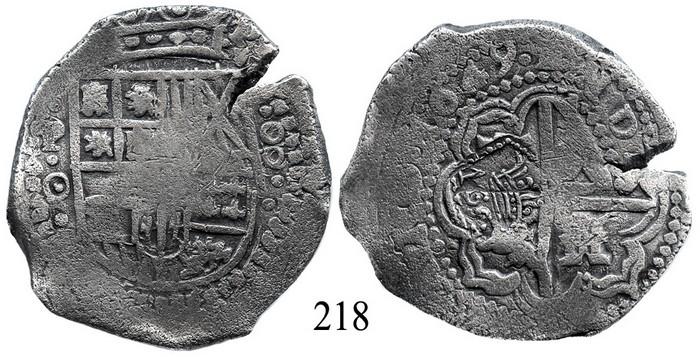 Potosí, Bolivia, cob 8 reales, 1649O, with pentagonal crowned-1652 countermark (rare) on cross. S-P35. 26.4 grams. Solid coin with full date, nearly full countermark, full •P•O• and denomination •8• flanking full shield below most of crown, full but partially weak cross, one edge-split, no corrosion but some flat spots, rare countermark. Recovered from: Capitana, sunk in 1654 off Chanduy, Ecuador.