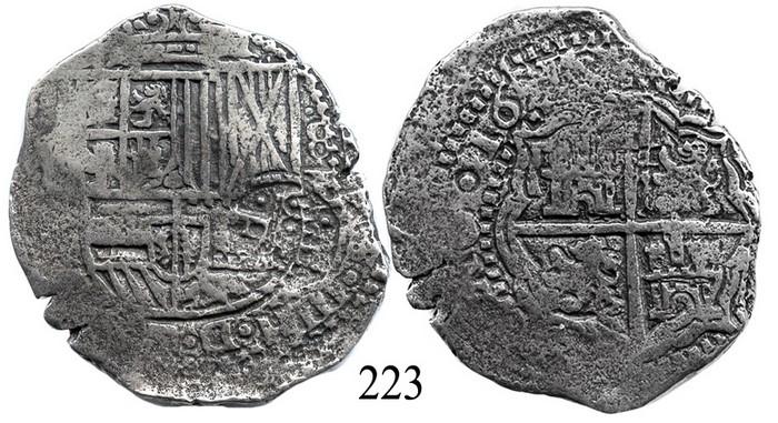 Potosí, Bolivia, cob 8 reales, 1651E, with crowned-•F• countermark (4-dot variety) on shield. S-P36. 23.2 grams. Full shield with full countermark showing the 2 dots above the crown as well (scarce thus), full but off-center cross, bold 16 but weak 51 of date, lightly corroded. Recovered from: Capitana, sunk in 1654 off Chanduy, Ecuador. With SubAmerica (Moro) photo-certificate #AB46.