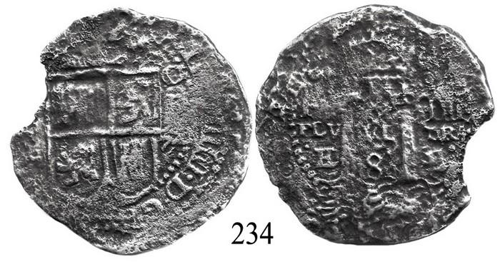 Potosí, Bolivia, cob 8 reales, 1652E transitional Type IV/A. S-P37. 17.8 grams. Corroded all over and with small piece of edge missing but with clear details (full shield with O-E-52 to right and pillars with F-[8]-IIII and E-8-E), some legend (king's ordinal IIII), lightly toned. Recovered from: Capitana, sunk in 1654 off Chanduy, Ecuador.