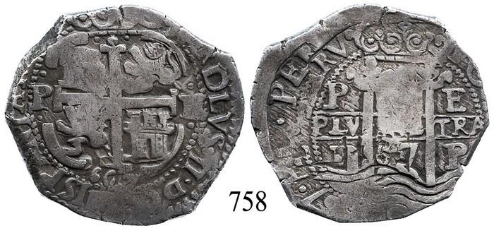 Potosí, Bolivia, cob 8 reales, 1667E, Charles II, unique error with O/L in king's name. S-P37b. 26.9 grams. Choice coin with full cross and pillars, well-detailed full crown, much legend including a full PERV and most of the king's name, which looks like "CARDLVS" due to the O being punched over an L, richly toned VF with 2 dates and assayers and 3 mintmarks.