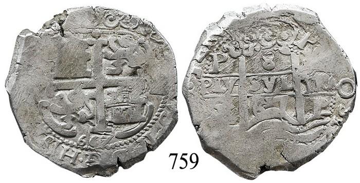 Potosí, Bolivia, cob 8 reales, 1667E, Charles II. S-P37b. 27.4 grams. Good full pillars and cross (well centered), nice crowns, 2 dates and mintmarks, non-toned AVF, first year of Charles II.