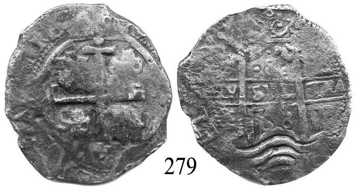 Potosí, Bolivia, cob 8 reales, 1668E. S-P37b. 20.5 grams. Well-centered strike, full cross and pillars-and-waves, with clear date, but quite corroded, somewhat toned. Recovered from: Unidentified wreck sunk ca. 1671 in Seville Harbor, Spain.