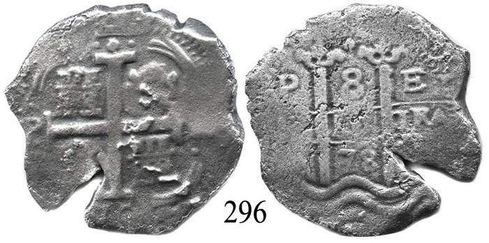Potosí, Bolivia, cob 8 reales, 1678E. S-P37b. 20.8 grams. Bold full cross and pillars-and-waves, bold P-8-E, 1½ dates, not so corroded as most but with split in edge. Recovered from: Consolación, sunk in 1681 off Santa Clara Island, Ecuador. With photo-certificate.