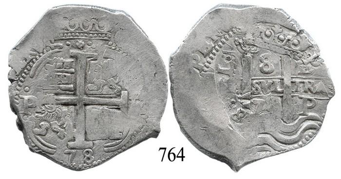 Potosí, Bolivia, cob 8 reales, 1678E. S-P37b. 26.8 grams. Choice full cross with full crown and bold date, full but slightly doubled pillars and crown, all on a broad flan, XF with flat spots.