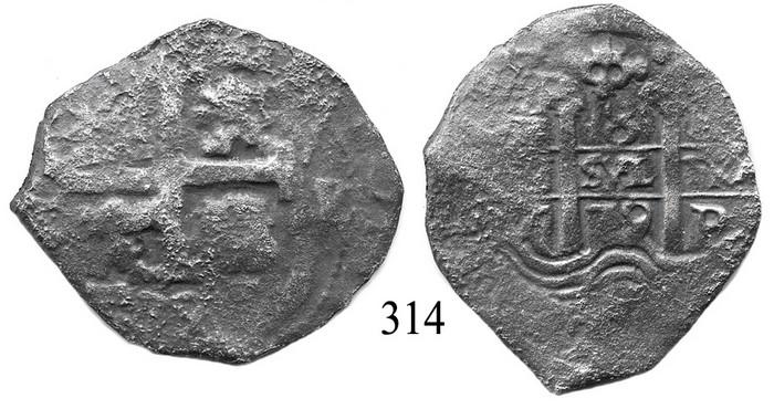 Potosí, Bolivia, cob 8 reales, 1679V/C, scarce. S-P39. 17.6 grams. Full pillars-and-waves, full but corroded cross, 2 dates and assayers (both with V/C), darkly toned. Recovered from: Consolación, sunk in 1681 off Santa Clara Island, Ecuador. With photo-certificate.